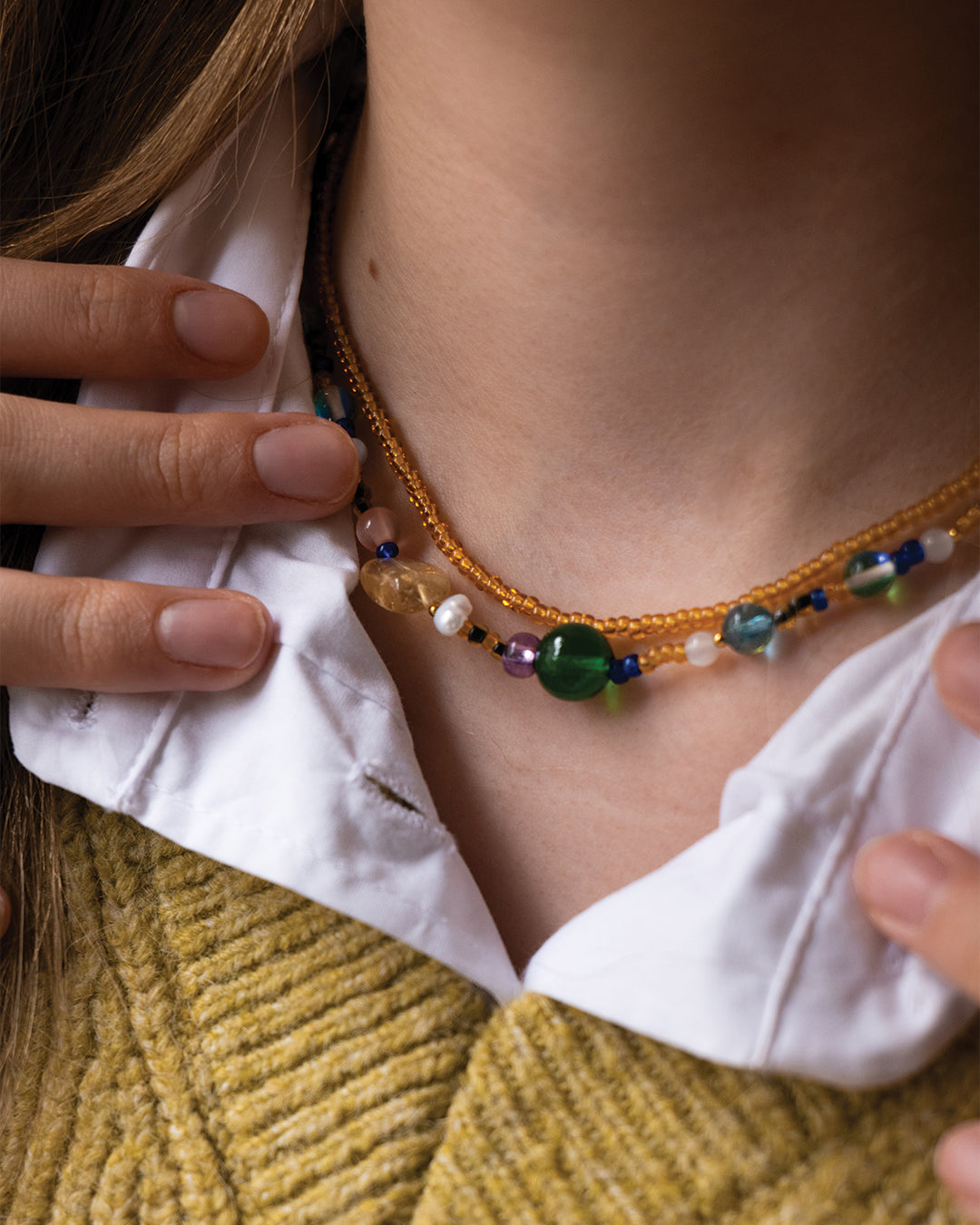 Unsere Amber Necklace überzeugt durch ihre wunderschönen bernsteinfarbenen Perlen. Durch die eher kleineren Perlen lässt sich unsere Amber Necklace perfekt mit anderen Ketten kombinieren.