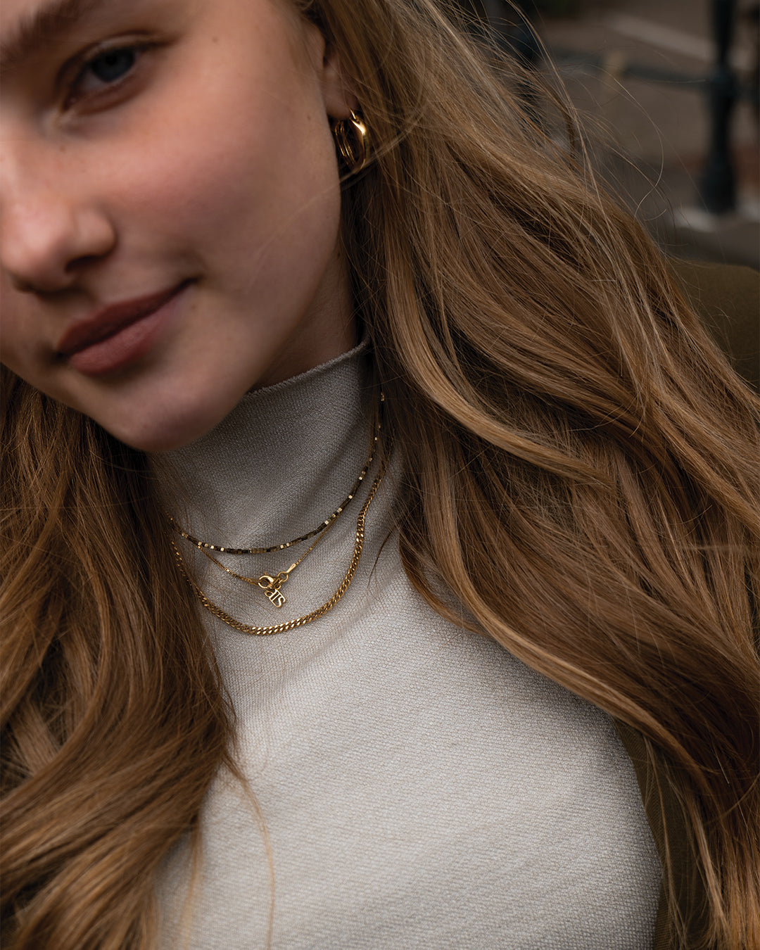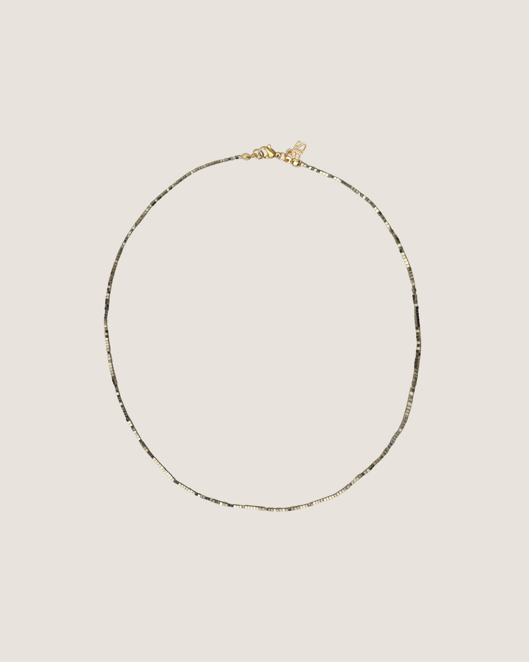 Unsere Lametta Necklace ist die perfekte Kette, um einen besonderen und funkelnden Moment zu schaffen. Die kleinen Hämatit Perlen in Messingoptik bringen jedes Outfit zum Strahlen.