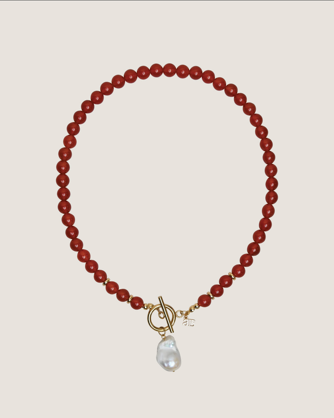 When elegance meets coolness. Unsere Ruby Necklace vereint genau diese Dinge miteinander - der angenehme Rotton im Kombination mit den kleinen goldenen Details und der großen Barockperle sorgt für einen echten Hingucker Moment. Der besondere Verschluss verleiht der schicken Kette das gewisse Etwas.