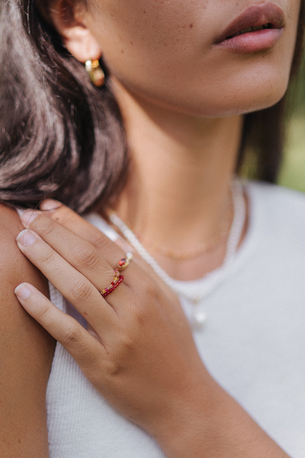 Time to shine! Mit unserem filigranen Glitter Ring in rubinrot setzt du gekonnt Akzente und kannst dein Ring Game aufs nächste Level heben. Egal ob gestapelt mit anderen Ringen oder simpel alleine getragen, unser Glitter Ring macht Lust auf sparkly moments.