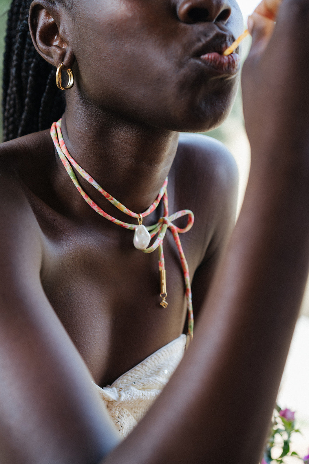 Unsere bunte Mermaid Necklace ist ein absolutes It-Piece für diese Saison. Das elastische Band mit Keshi Anhänger, doppelt umgelegt, sorgt für einen modernen Look, der besonders schlichte Outfits aufwertet.