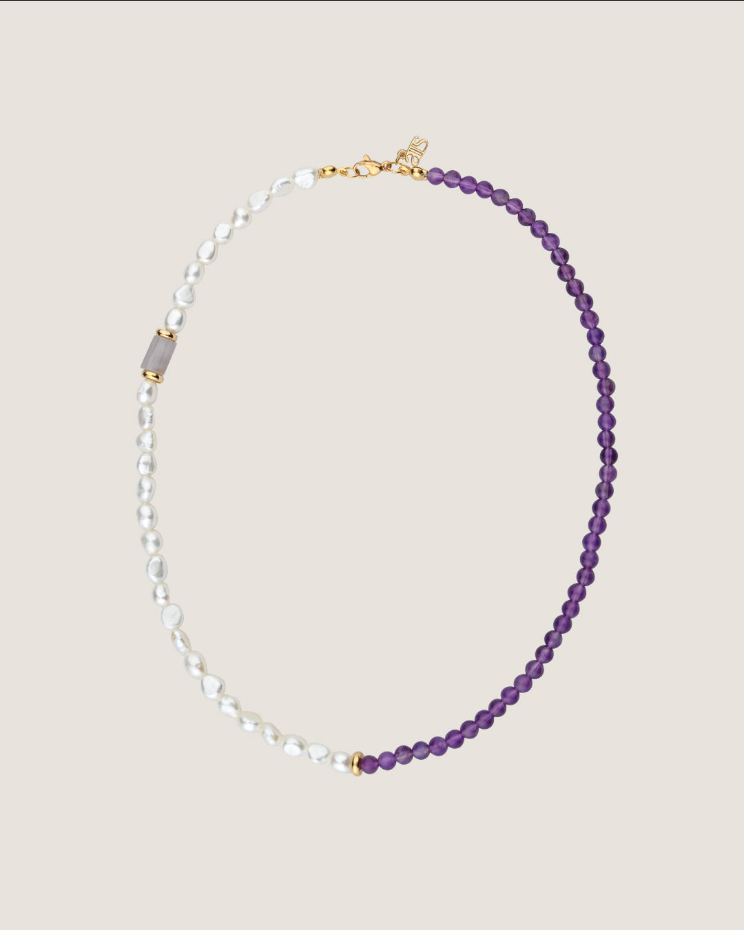Die lilanen Amethyst Perlen in Kombination mit den echten Süßwasserperlen und kleinen Goldelementen strahlen einen special vibe aus und wirken sehr harmonisch. Zur Mystic Necklace gibt es auch das passende Bracelet und Ringe.