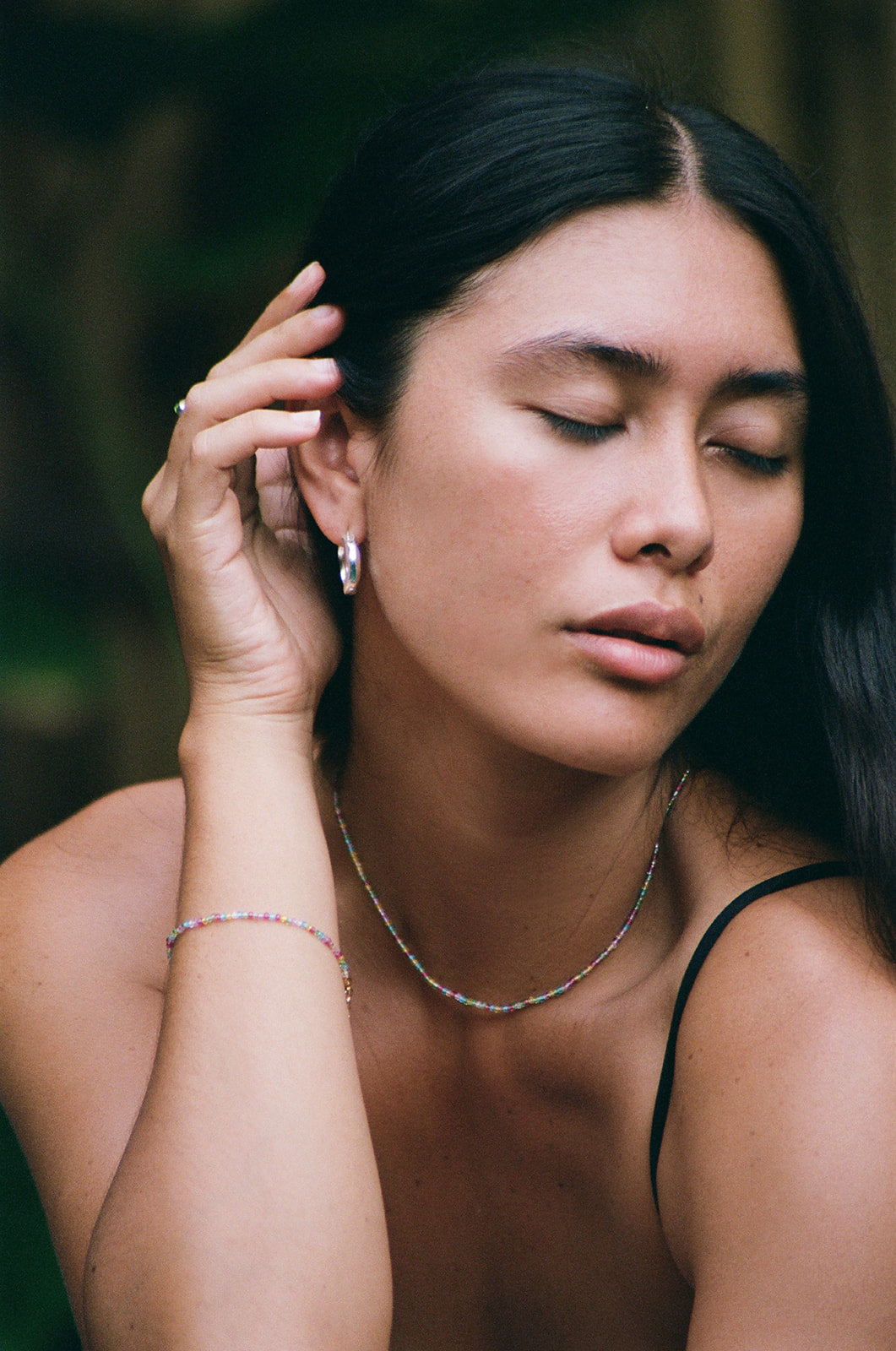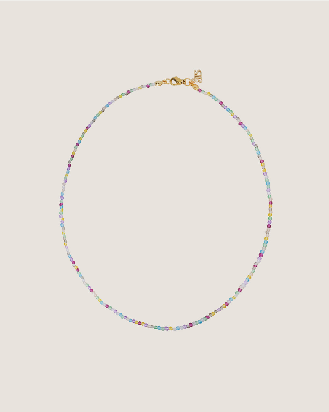Die sanften Pastelltöne unserer Sky Necklace passen sich perfekt jedem Outfit an. Die geschliffenen Glasperlen sorgen für ein dezentes funkeln, was besonders im Sonnenschein wunderschön aussieht.