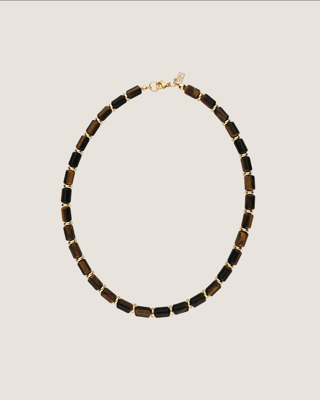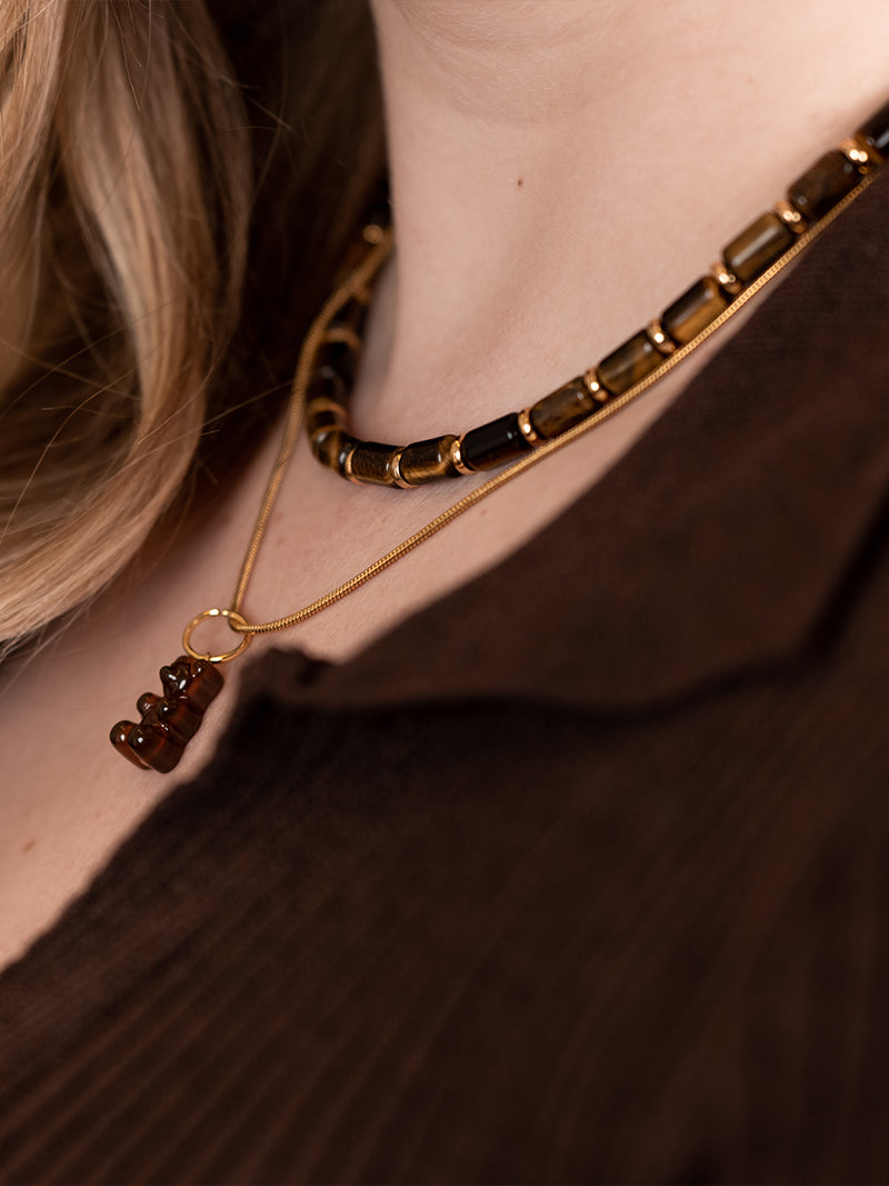 Die warmen Braun- und Goldtöne verleihen unserer Toffee Necklace einen edlen Touch. Die Kette ist ein wahrer Hingucker und sieht mit weiteren Goldschmuckstücken getragen wunderschön aus. Die eckige Form der Perlen wirkt besonders und sehr wertig.